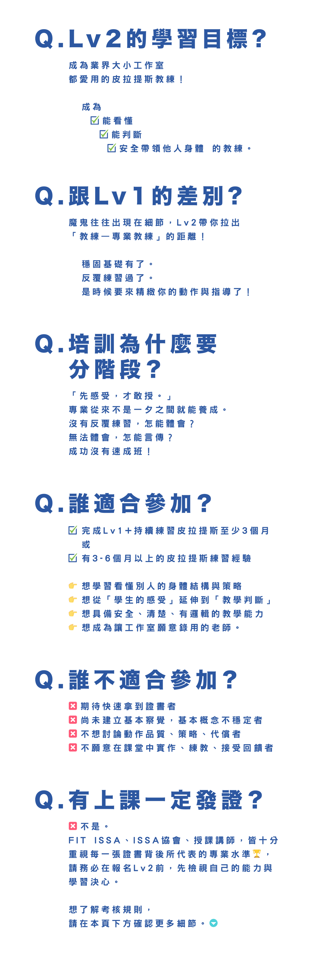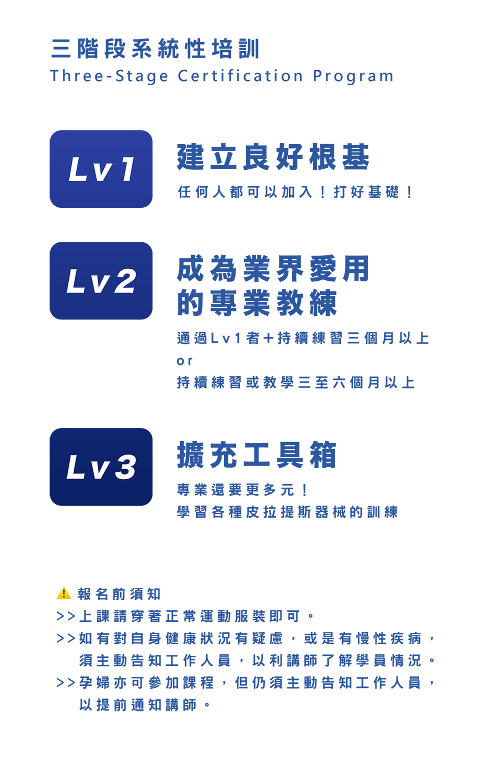 - 本培訓課程共分為三個階段(Level 1~3),Lv2 將有嚴謹的考核標準,建議沒有基礎或皮拉提斯初學者,先參加 Lv1 培訓,以建立正確且穩固的基礎。